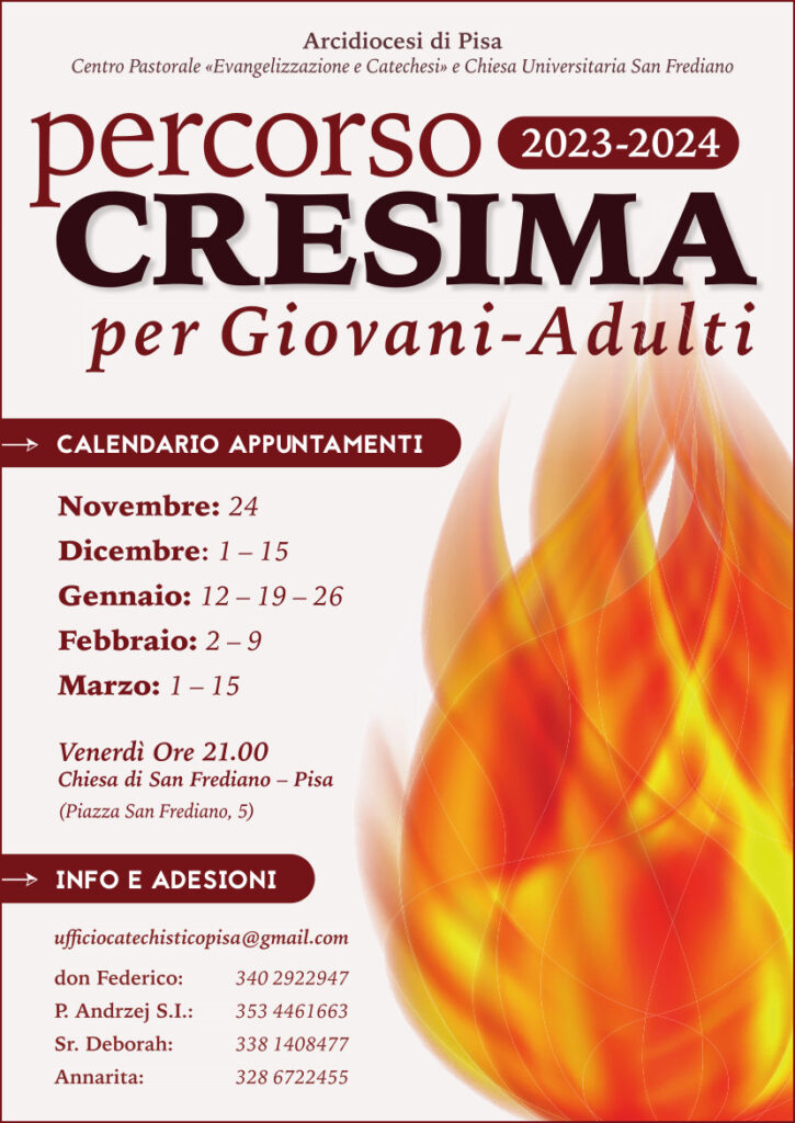 nei locali di S. Frediano a Pisa (zona piazza dei Cavalieri, dove si trovava la sede della Misericordia qualche anno fa) ha inizio il cammino di preparazione al Sacramento della Cresima per giovani e adulti, coordinato dall’Ufficio Catechistico in collaborazione con i Padri Gesuiti, le Suore Apostoline e i Catechisti di San Frediano.
