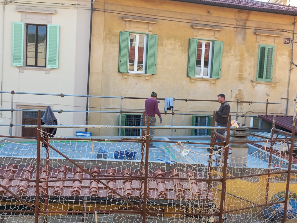 L’obiettivo principale, come già detto, era la copertura ma abbiamo colto l’occasione per dare un volto migliore anche a tutto l’esterno, soprattutto alla parete esterna lungo la strada; qui è stato necessario un lavoro più lungo del previsto perché abbiamo dovuto rifare completamente gli intonaci.