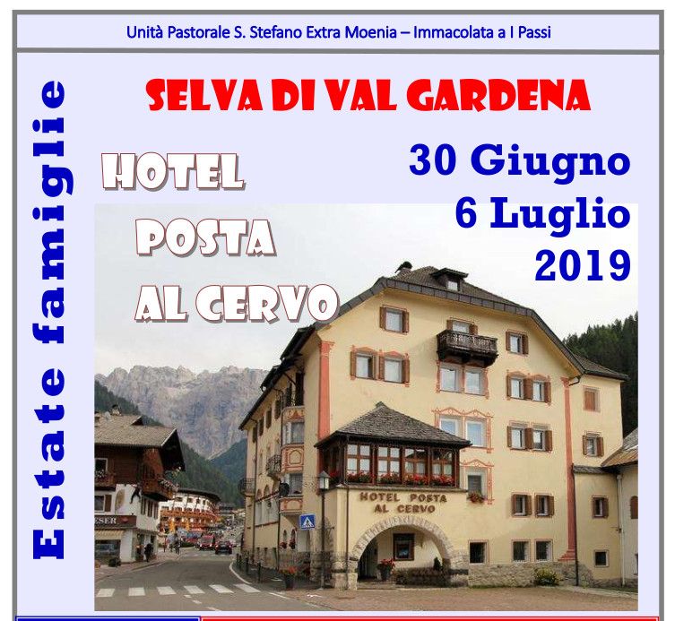 Dal 30 giugno al 6 luglio alcune famiglie e single di ogni specie della nostra parrocchia e non solo hanno trascorso una settimana di vacanza a Selva di Val Gardena (sui 1.500 m. slm.) insieme a don Carlo e a Lorenzo, che praticamente tutti conosciamo per il suo servizio pastorale a Santo Stefano e.m. in quanto seminarista pisano.