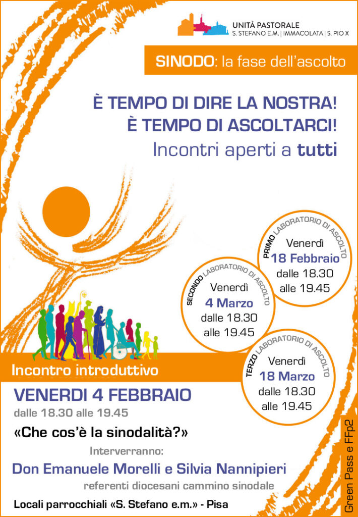 L’invito a metterci insieme in cammino, ad attivare processi sinodali, a 60 anni dal Concilio, è fatto a tutta la Chiesa. Nelle forme che già conosciamo, come le Parrocchie e le Diocesi. E il nostro Arcivescovo, Giovanni Paolo, si sta spendendo per stimolare e guidare questo tempo di ascolto e di ricerca. Ma anche nelle nuove articolazioni che hanno l’obiettivo di raccogliere e coordinare le iniziative della comunità cristiana in una realtà sociale in continua trasformazione. Ecco allora i vari Consigli Pastorali, dell’Unità Pastorale (che raccoglie l’insieme di più Parrocchie) e del Vicariato (relativo a quella porzione di territorio che abbraccia più paesi o più quartieri della città: nel nostro caso Pisa Nord-Ovest).