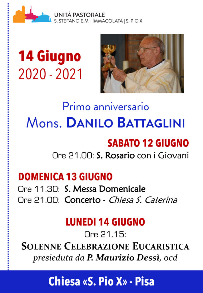 Nella ricorrenza del primo anniversario di ascesa al Cielo di don Battaglini, verrà raccolta un’OFFERTA libera e anonima che potrete consegnare a don Carlo, don Federico, Mauro, Stella e Silvia in busta chiusa.