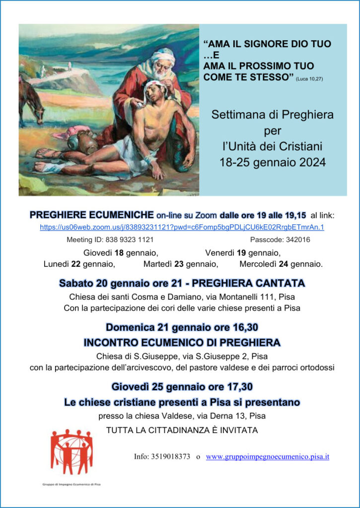 A Pisa, il “Gruppo Diocesano di Impegno Ecumenico” propone diverse iniziative per vivere con intensità la Settimana di Preghiera per l’Unità dei Cristiani: in primis la possibilità, in diversi giorni, di partecipare a brevi incontri di preghiera on-line tramite Zoom. Sabato 20, alle ore 21.00, nella Chiesa dei Santi Cosma e Damiano a Pisa avrà luogo un incontro di preghiera cantata da rappresentanti delle varie Chiese presenti sul nostro territorio.