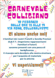 C’è anche una novità, che può motivare e sostenere l’intenzione di riallacciare il collegamento con i ragazzi di Colle. È appena nata l’“Associazione Amici della Maffi – NOI”, che vuole proprio favorire la conoscenza, la comunicazione, la relazione delle persone preziose che risiedono nelle strutture della Maffi con tutti quelli che, come volontari, desiderano contribuire in qualche maniera alla loro “cura”. Come? Anche facendo festa per il Carnevale insieme!