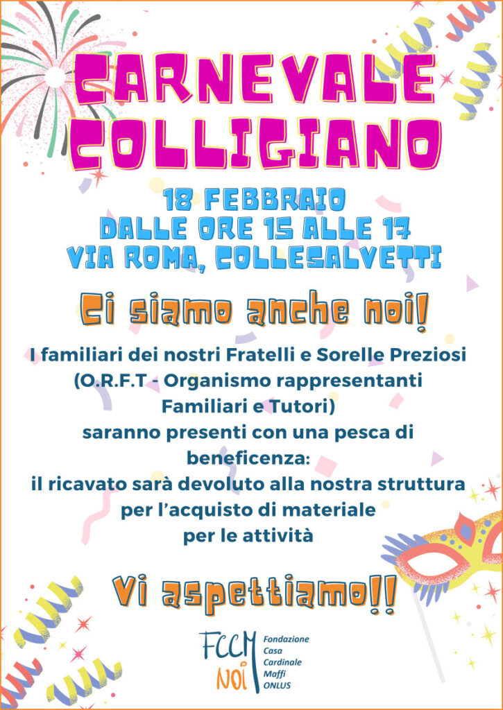 C’è anche una novità, che può motivare e sostenere l’intenzione di riallacciare il collegamento con i ragazzi di Colle. È appena nata l’“Associazione Amici della Maffi – NOI”, che vuole proprio favorire la conoscenza, la comunicazione, la relazione delle persone preziose che risiedono nelle strutture della Maffi con tutti quelli che, come volontari, desiderano contribuire in qualche maniera alla loro “cura”. Come? Anche facendo festa per il Carnevale insieme!