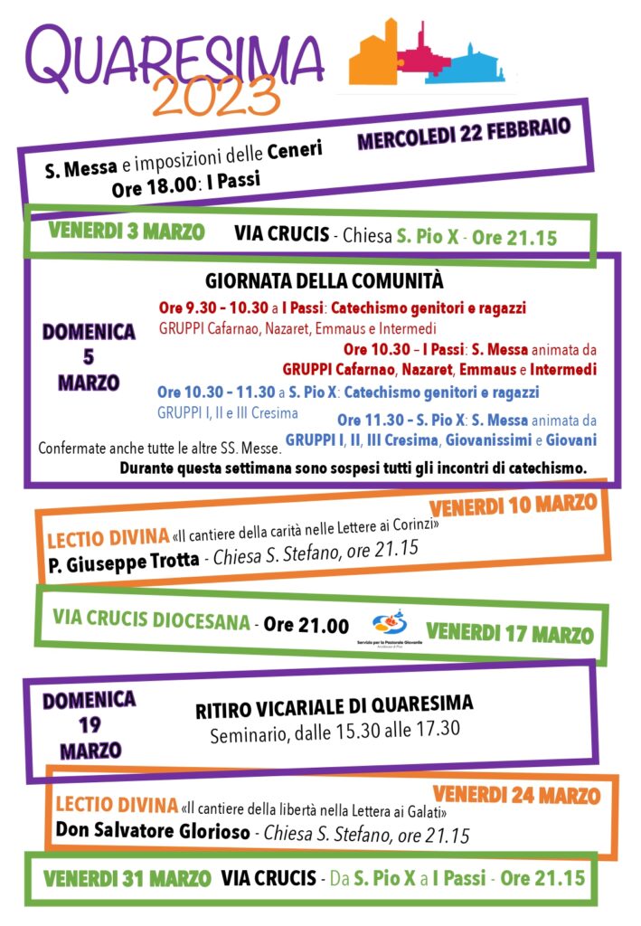 Come già emerso nell’ultimo incontro sinodale, stiamo continuando a lavorare nei «Cantieri della strada e del villaggio», «dell’ospitalità e della casa» e «della diaconia e della formazione spirituale», declinati, nella nostra Unità Pastorale, rispettivamente come «il cantiere dei temi etici», «il cantiere Mensa/San Vincenzo», il «cantiere dell’Ascolto della Parola». Per questo, nello strutturare il cammino della Quaresima 2023, il Consiglio di Unità Pastorale, a proposito dell’ultimo cantiere, ha pensato di alternare – nei venerdì di Quaresima – la «Via Crucis» e la «Lectio Divina», invitando due biblisti – P. Giuseppe Trotta S.I. e don Salvatore Glorioso – a «spezzare» per noi la Parola.