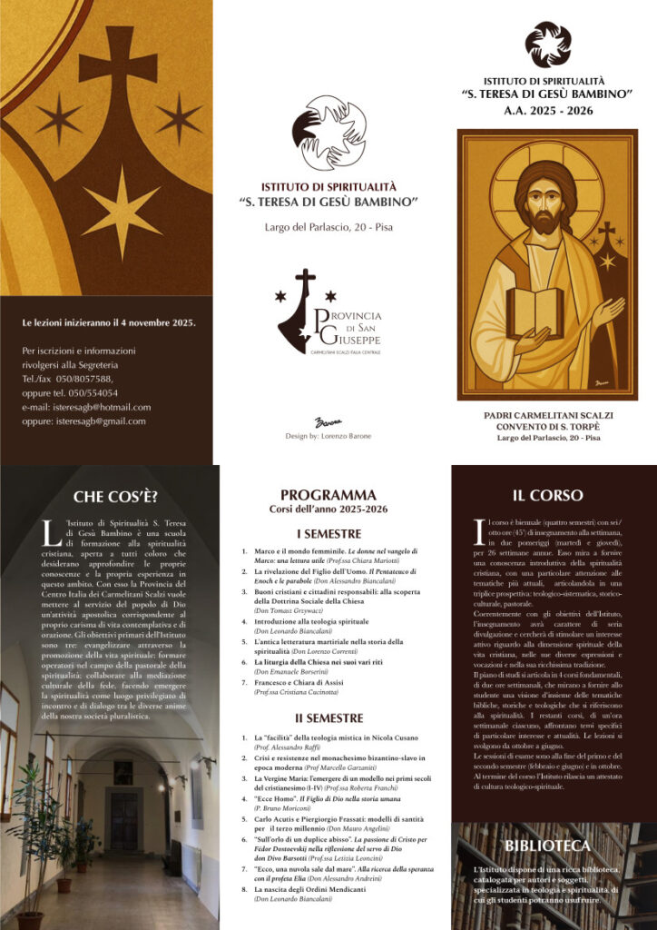 L’Istituto di Spiritualità S. Teresa di Gesù Bambino è una scuola di formazione alla spiritualità cristiana, aperta a tutti coloro che desiderano approfondire le proprie conoscenze e la propria esperienza in questo ambito. Con esso la Provincia del Centro Italia dei Carmelitani Scalzi vuole mettere al servizio del popolo di Dio un’attività apostolica corrispondente al proprio carisma di vita contemplativa e di orazione. Gli obiettivi primari dell’Istituto sono tre: evangelizzare attraverso la promozione della vita spirituale; formare operatori nel campo della pastorale della spiritualità; collaborare alla mediazione culturale della fede, facendo emergere la spiritualità come luogo privilegiato di incontro e di dialogo tra le diverse anime della nostra società pluralistica.