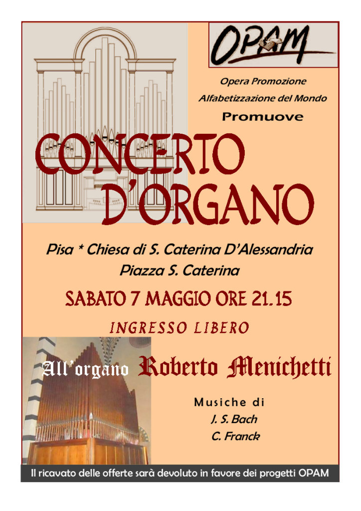 Concerto d’organo redazione 10 anni fa Sabato 7 Maggio ore 21.15 Concerto d’organo promosso dall’Opam.