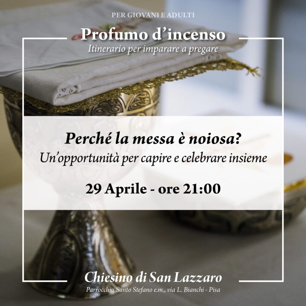 Lunedì 29 Aprile, con inizio puntuale alle 21.15, avrà luogo – nel nostro Chiesino – l’ultimo degli incontri del ciclo sulla preghiera «Profumo d’incenso», organizzato dal Centro Diocesano Vocazioni.