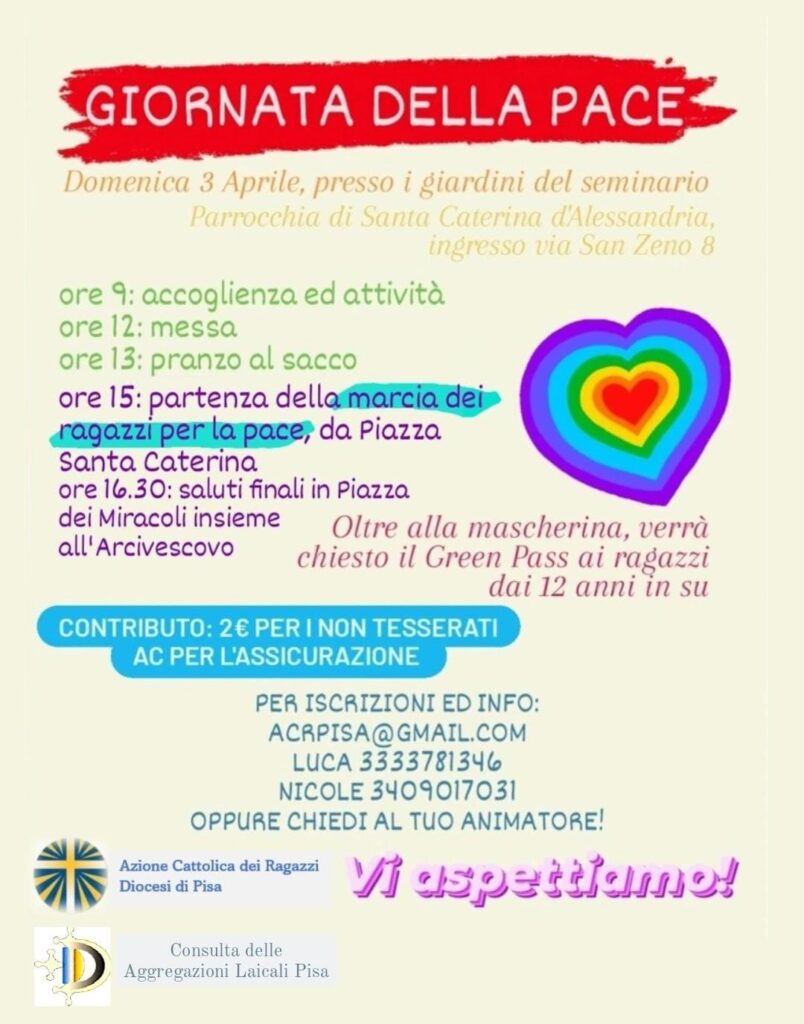 - L’Azione Cattolica Diocesana promuove una MARCIA DELLA PACE, Domenica 3 Aprile con partenza alle 15.00 da Pizza S. Caterina a Pisa e arrivo in Piazza dei Miracoli, dove sarà presente anche l’Arcivescovo. Riteniamo che questa possa essere una preziosa occasione per dare – come comunità cristiana – un segno visibile contro ogni guerra e a sostegno della pace. Alla marcia invitiamo a partecipare anche i gruppi di Catechismo (chiedendo ai catechisti di fare la loro parte), le famiglie e gli adulti: partecipiamo numerosi!